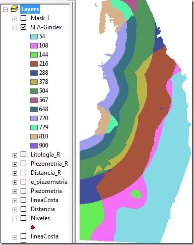 Para calcular la vulnerabilidad a la intrusión marina con ArcGIS, utilizando el método SEA-GIndex, debemos tener tres mapas: La distancia a la costa, La altura piezométrica y la Litología